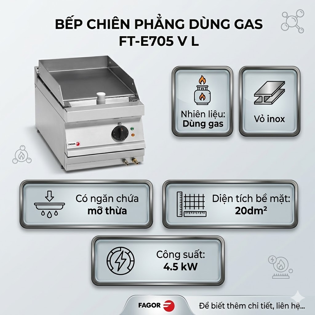 Bếp rán phẳng dùng gas FTE7-05 V L là dòng sản phẩm có công suất cao của hãng Fagor nhập khẩu từ Tây Ban Nha phù hợp sử dụng trong các nhà hàng mang theo phong cách ẩm thực Châu Âu để chế biến các món ăn như: bò bít tết, thịt, gà, …